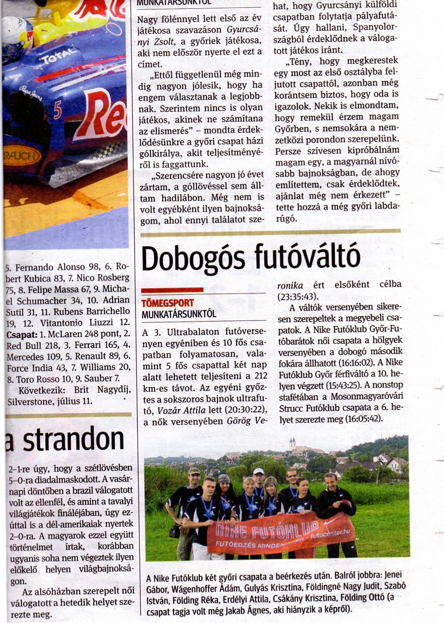 A hétvégén teljesítették csapataink az UltraBalaton 212 km távját, a kétnapos 5 fõs váltók versenyében a fiúk az elõkelõ 10. helyet szerezték meg idejük: 15:43:25. A lányok a dobogó második fokára állhattak 16:08:33 (Abszolútban 14. hely). A fiúk a második nap a lány csapatot segítve futották végig a versenyt (90 csapat indult). A gyõri FutOltó fiúk 14. helyen végeztek.