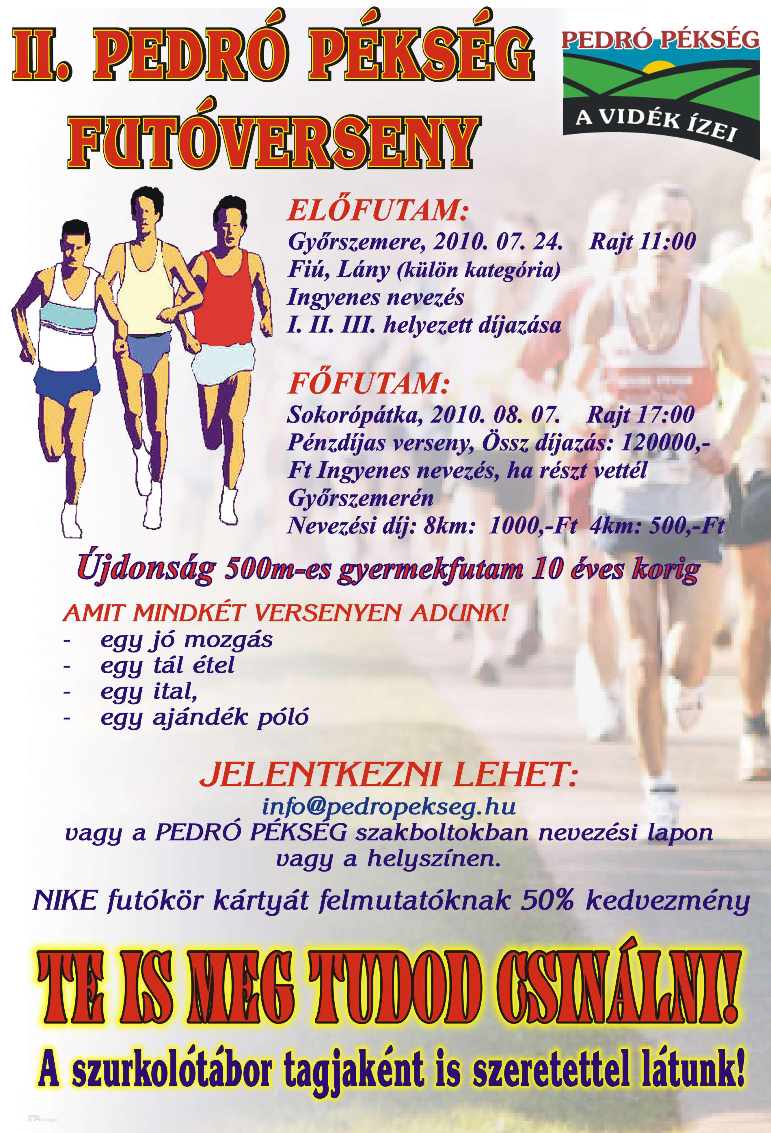 On-Line elõnevezni, a www.nevezes.hu oldalon, személyesen pedig a gyõri Spuri Futóboltban lehet csütörtökig. A fenti idõpont után már csak a helyszinen lehet nevezni emelt áron!
